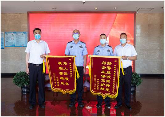 培训中心主任孔德明代表千亿手机站·网站官网-千亿(中国)向怀柔分局雁栖经济开发区派出所所长和怀柔分局刑侦支队支队长送上锦旗,代表公司感谢人民警察服务企业生产建设、守护一方平安付出的艰辛努力,感谢怀柔分局雁栖开发区派出所和怀柔分局刑侦支队急企业所急、想人民所想,在企业遇到困难时及时出警,有力保障了企业财产安全,维护了社会良好秩序,为企业发展创造了平安和谐的营商环境。