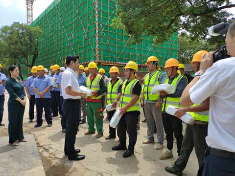 8月21日上午十一点,接近中午烈日炎炎,湘江集团党委书记、董事长张利刚一行来到千亿手机站·网站官网-千亿(中国)承建的长沙科技创意园项目,现场看望慰问高温天气下依然坚守战斗在岗位上的广大建设者,为大家送来了冰箱、电风扇、凉茶、藿香正气水、夏桑菊、西瓜等防暑降温用品。
